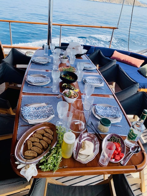 If you're looking for unique things to do in Mykonos, this private Mykonos food and sailing tour is perfect for you! Ride aboard a traditional Greek wooden boat (kaiki) for 45 minutes to a beautiful non-touristy destination for your authentic private Greek cooking demonstration and meal. Depending on the winds, you may be whisked away to a sandy beach on Rhenia next to the ancient island of Delos (a UNESCO World Heritage site) or sail along the south Mykonos beaches which are more protected from the winds. You will enjoy your meal on your kaiki that has a shaded dining area that will be docked where your cooking demonstration will be conducted.