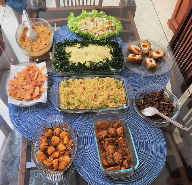 • Menu 2: Yellow rice + Dhal (lentil curry) + Batu moju (eggplant pickle) + Fish/Chicken + Curd with treacle