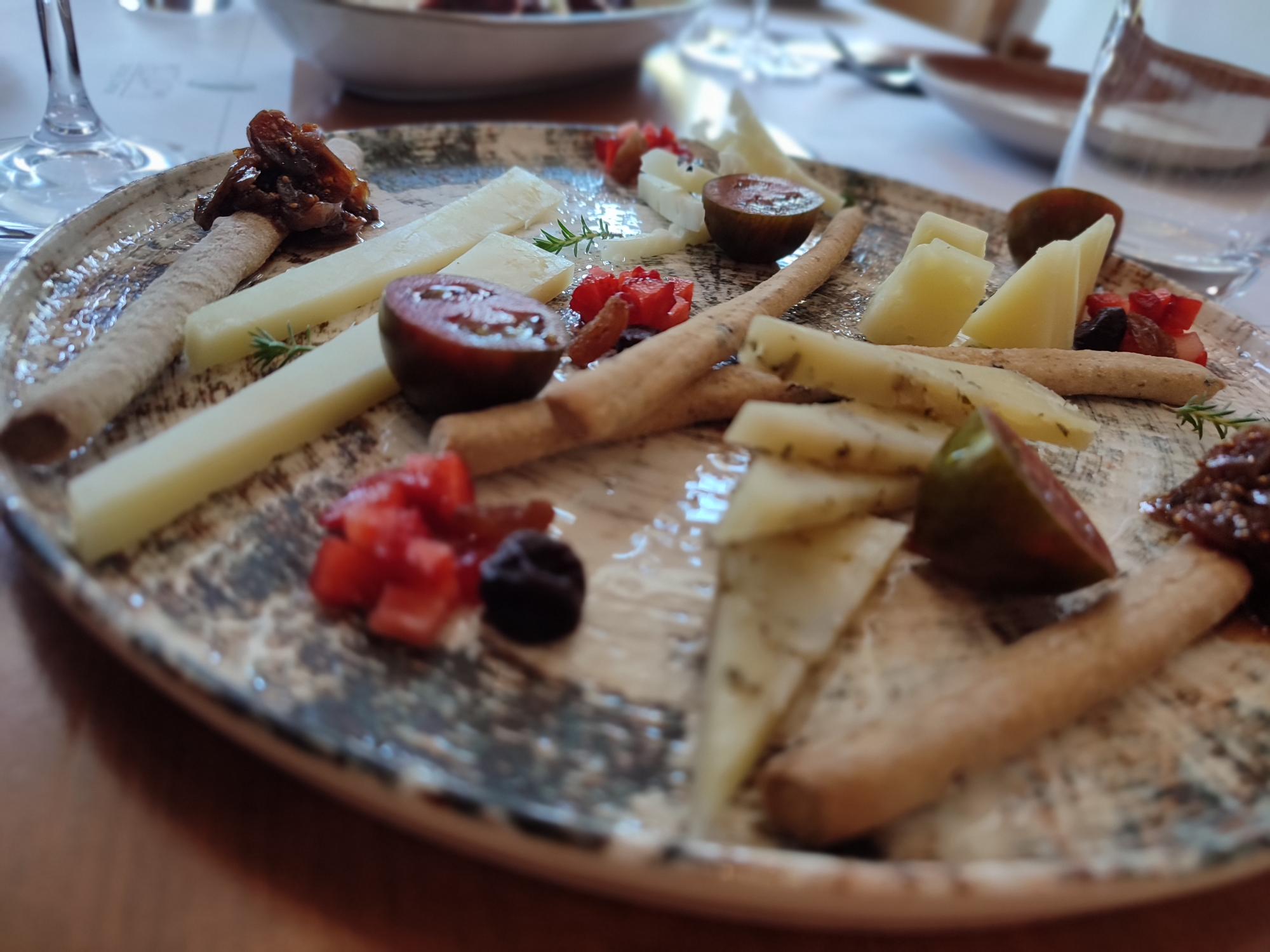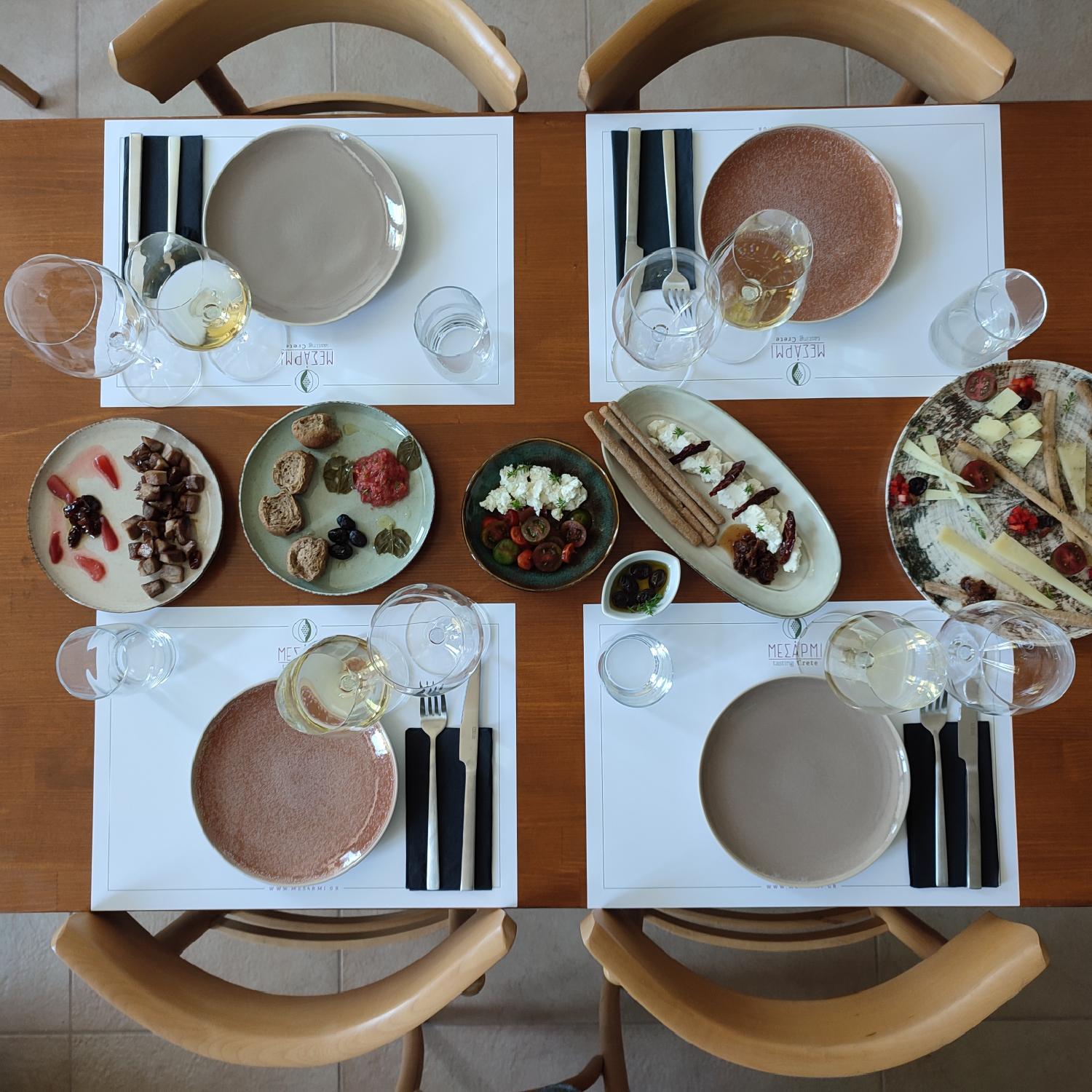 The wine tasting includes 5 wines, which come from different wineries on the island and are made with local grapes. The offered wines can also be chosen according to your preference (white, rosé, red), which again needs to be discussed in advance with Stella and within the budget. You will be given a pencil, a leaflet (which includes information about the Cretan vineyard, the grapes, the way one tastes and appreciates wine aromas and some space to keep the wine tasting notes) and post cards to remember the tasting experience. By tasting different wines (winemaker, style, grapes) it will give you insight to a wide variety of wines that come from Crete. The dishes offered during the wine tasting are local products such as cheese, season fruit, some homemade sauce (bell peppers or tomatoes) served with paximadi (a local rusk), jams, sundried tomatoes and local smoked ham called apaki.