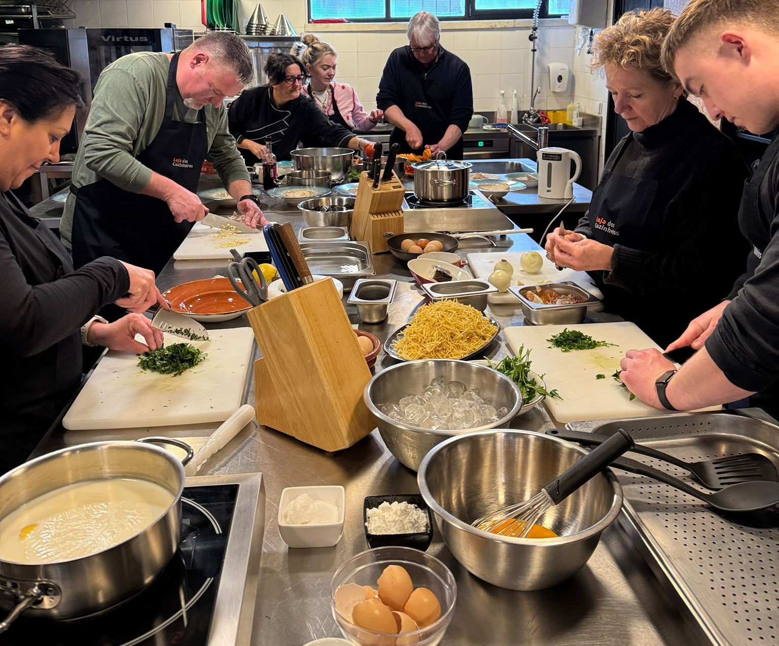 In the picturesque city of Lisbon, where the sun blends with the aroma of spices floating through the streets, two friends found their calling in a vibrant kitchen full of stories. Meet Ana and Carina, two professional chefs whose love to cook and wish to share their Portuguese food, culture and culinary traditions with the world. Both of them got their culinary training at the ACPP - Portuguese Association of Professional Cooks, and worked as chefs in traditional Portuguese restaurants in Lisbon. Later, their passion for teaching grew stronger and they started conducting cooking classes for locals and tourists. For Ana and Carina, the real magic happens when the people start cooking together. As they mix ingredients and share stories with each other, they create bonds that go beyond the kitchen. For a moment, borders disappear and everyone becomes part of one big family, united by a passion for good food and the rich cultural heritage of Portugal.