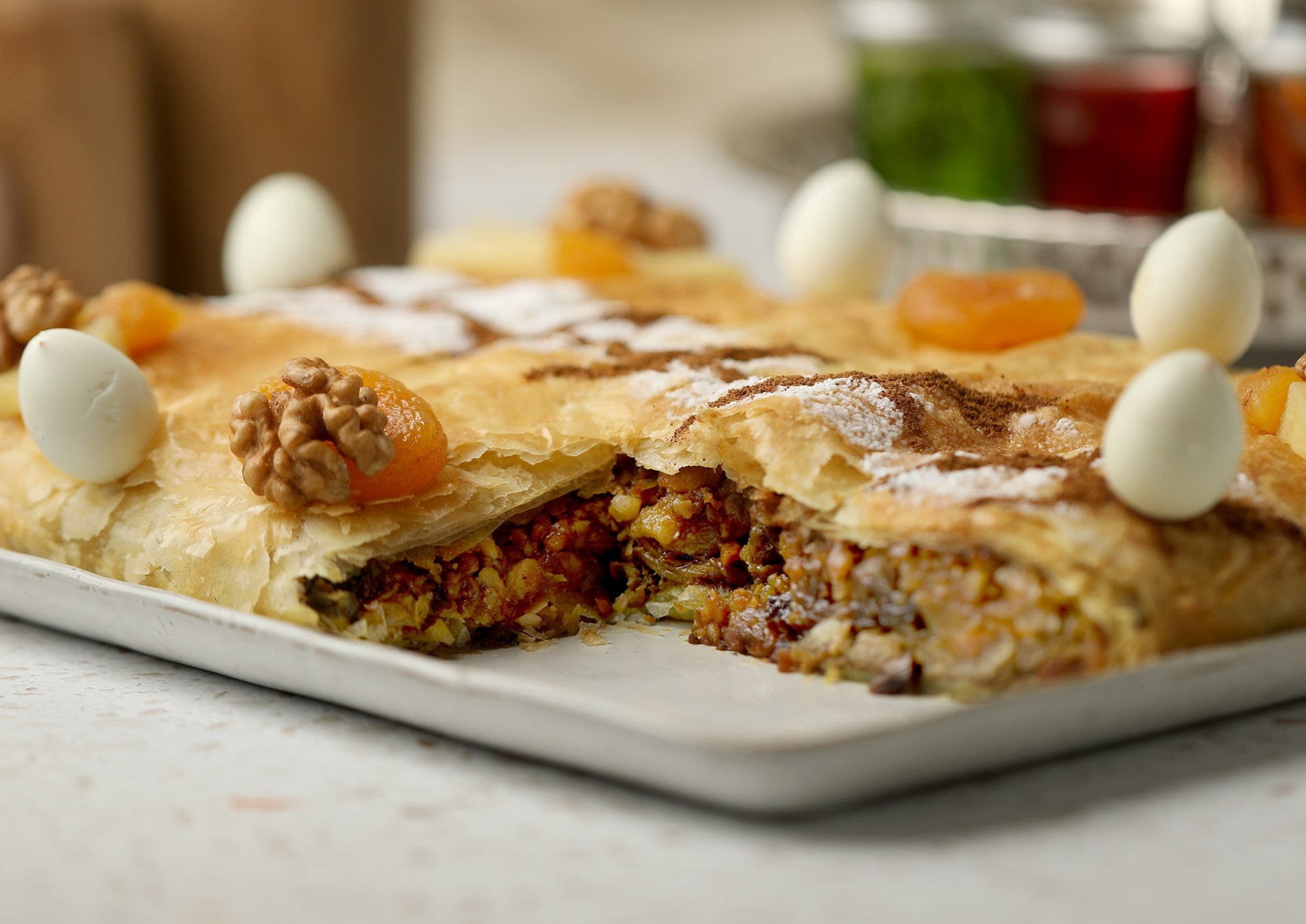 • Menu 2: Taktouka (roasted pepper and tomato salad), Beef Tagine with caramelized prunes and almonds, and Jawhara