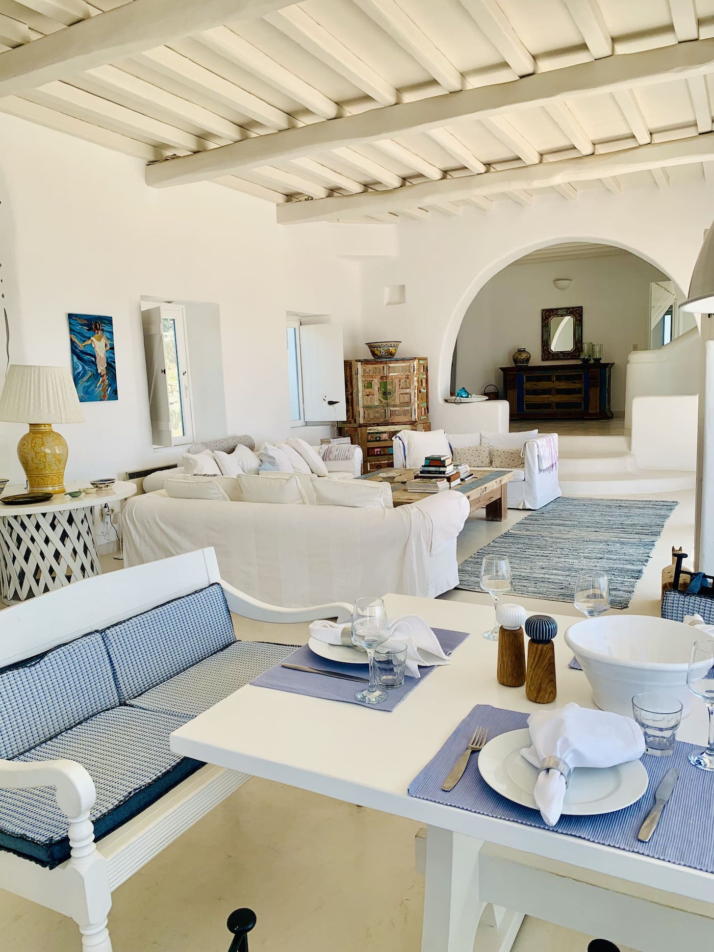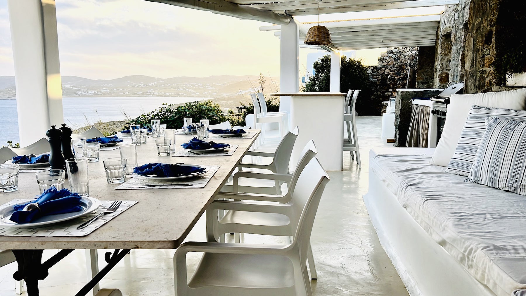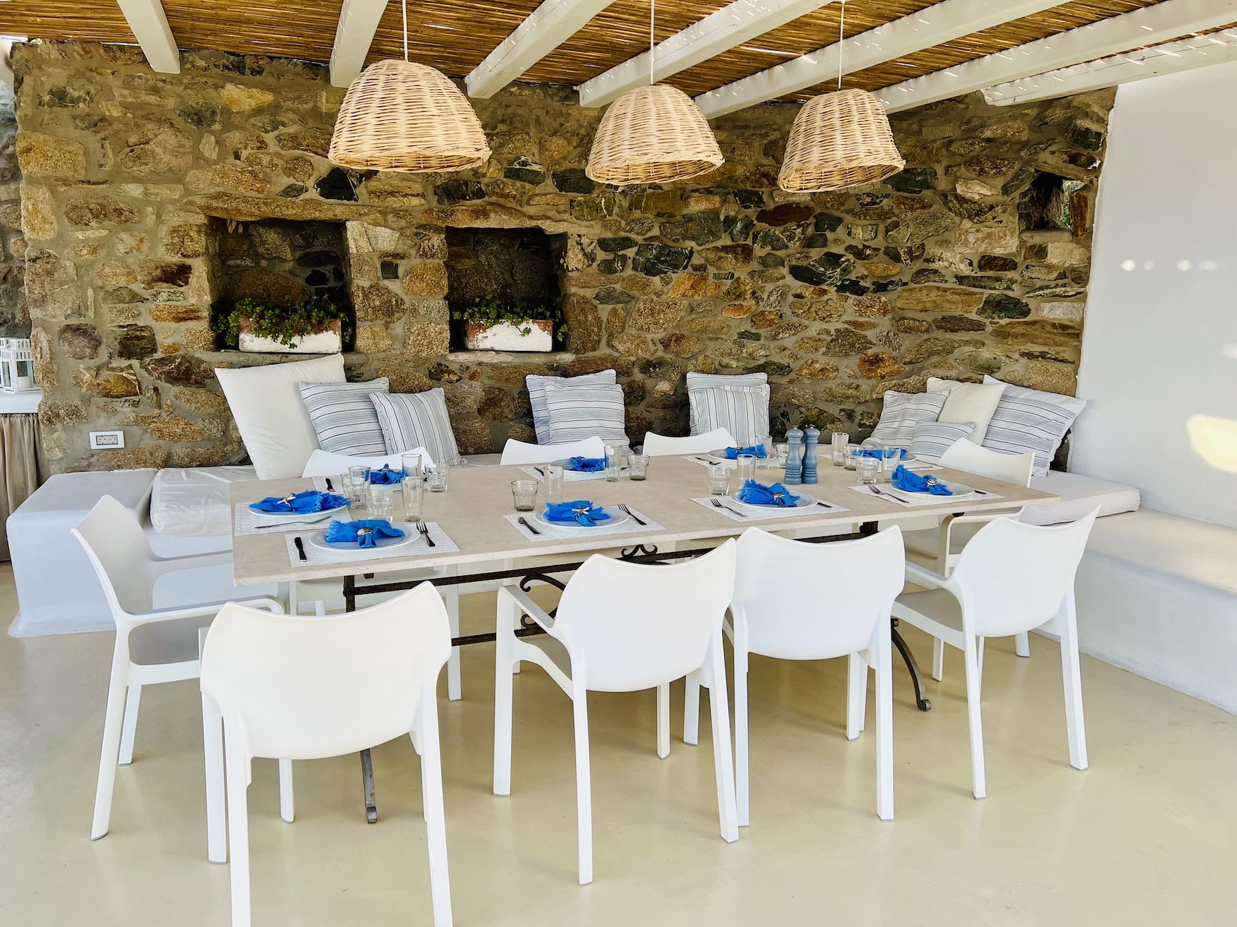 The Villa: Located 20 minutes from Mykonos town and just three minutes drive from the island's most beautiful beach, Lia, the villa accommodates up to 10 guests in five spacious bedrooms. With stunning indoor and outdoor dining areas, a Mediterranean garden, a pool, and panoramic views of Paros and Naxos, it’s the ultimate retreat. Daily cleaning, brunch preparation, and a selection of fine Greek wines make your stay as indulgent as it is inspiring.