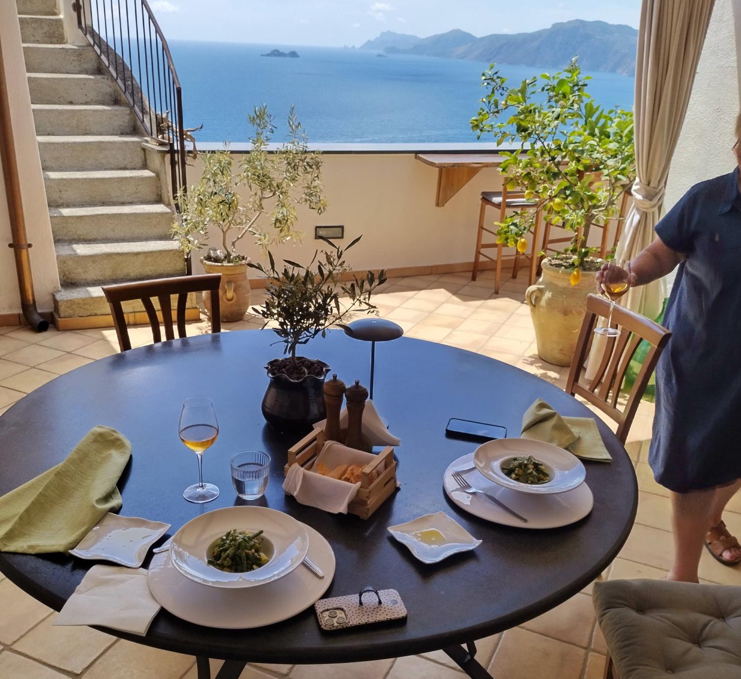 Cooking experience: (1-6 guests) Join local chef Sergio for an unforgettable Italian cooking class in Praiano, just a short distance from Positano or Sorrento on the stunning Amalfi Coast. Visiting Praiano is a great way to discover the untouched spots of the Amalfi Coast. Join Sergio in his terrace apartment with breathtaking views of Positano and the coast for a hands-on Italian cooking class. In his large and comfortable home kitchen, you will learn to cook a traditional Italian meal using valuable tips and techniques, along with family recipes passed down through generations. During your 2-hour hands-on Praiano cooking class, learn to make homemade pasta like cavatelli, gnocchi, or ravioli and fresh sauces such as basil pesto or parmigiana di melanzane (eggplant parmigiana), or tiramisu. After cooking, sit down on the terrace to enjoy the delicious meal you’ve helped prepare, paired with local wine made by Sergio himself, all while taking in the stunning views of the horizon. This intimate cooking class offers a unique way to discover the flavors of the Amalfi Coast and connect with local culture.