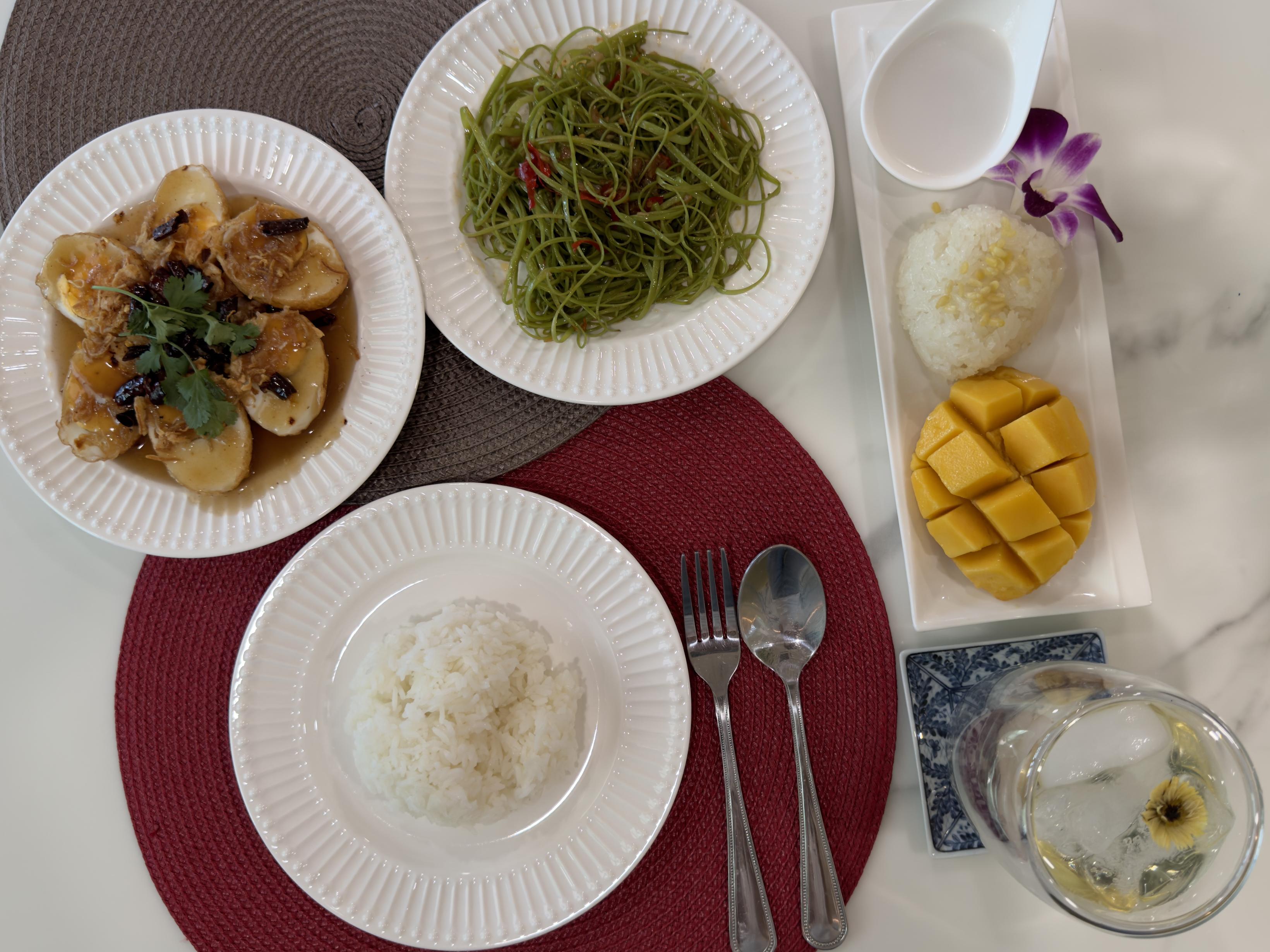 In-home meal: (1-5 guests) A meal at Apple’s home offers a unique and delightful culinary experience in Bangkok, where guests can enjoy both Thai and Chinese-inspired dishes while soaking in the charm of her rustic yet vibrant surroundings. After you've been picked up from the monorail station, enjoy the scenic ride to Apple's home through the countryside, passing rice fields and occasionally spotting cows and buffalos along the way. Then at Apple’s dining table, you’ll share a home-cooked Thai meal that features authentic dishes rarely found in restaurants, showcasing family favorites passed down through generations. The meal begins with refreshing drinks like pandan juice or lemongrass juice. For appetizers, you’ll taste morning glory salad with shrimp and pork. The main course is served with fragrant jasmine rice or vibrant butterfly pea rice (with its striking purple hue), and may include chicken green curry with winter melon or stir-fried pork with garlic and pepper or fried boiled egg with tamarind sauce. To finish the meal, indulge in a comforting poached banana in sweet coconut milk with coconut meat. This experience at Apple’s home combines delicious flavors, traditional family recipes, warm hospitality and introduction to Thai food and culture.