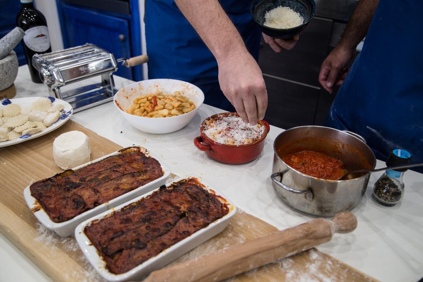 Cooking experience: (2-7 guests) Join Stefanie and her mother, Ester, for a traditional cooking class in the heart of Capri, where they will share authentic family recipes and secrets passed down through generations. This hands-on cooking experience highlights the simplicity of local ingredients, traditional methods, and time-honored family recipes. Enjoy a refreshing aperitivo upon arrival before starting your Capri cooking class, where you'll learn to make delicious stuffed ravioli Capresi and Caprese lemon cake from scratch. You will also help assemble the famous eggplant parmigiana. While you cook, Stefanie will offer insights into traditional foods, local ingredients, recipes, and the foundation of the Mediterranean diet. By the end of the class, you’ll have the skills and knowledge to recreate these dishes at home. The entire experience lasts about 3 hours, from hands-on cooking to enjoying the meal and wine pairing afterward.