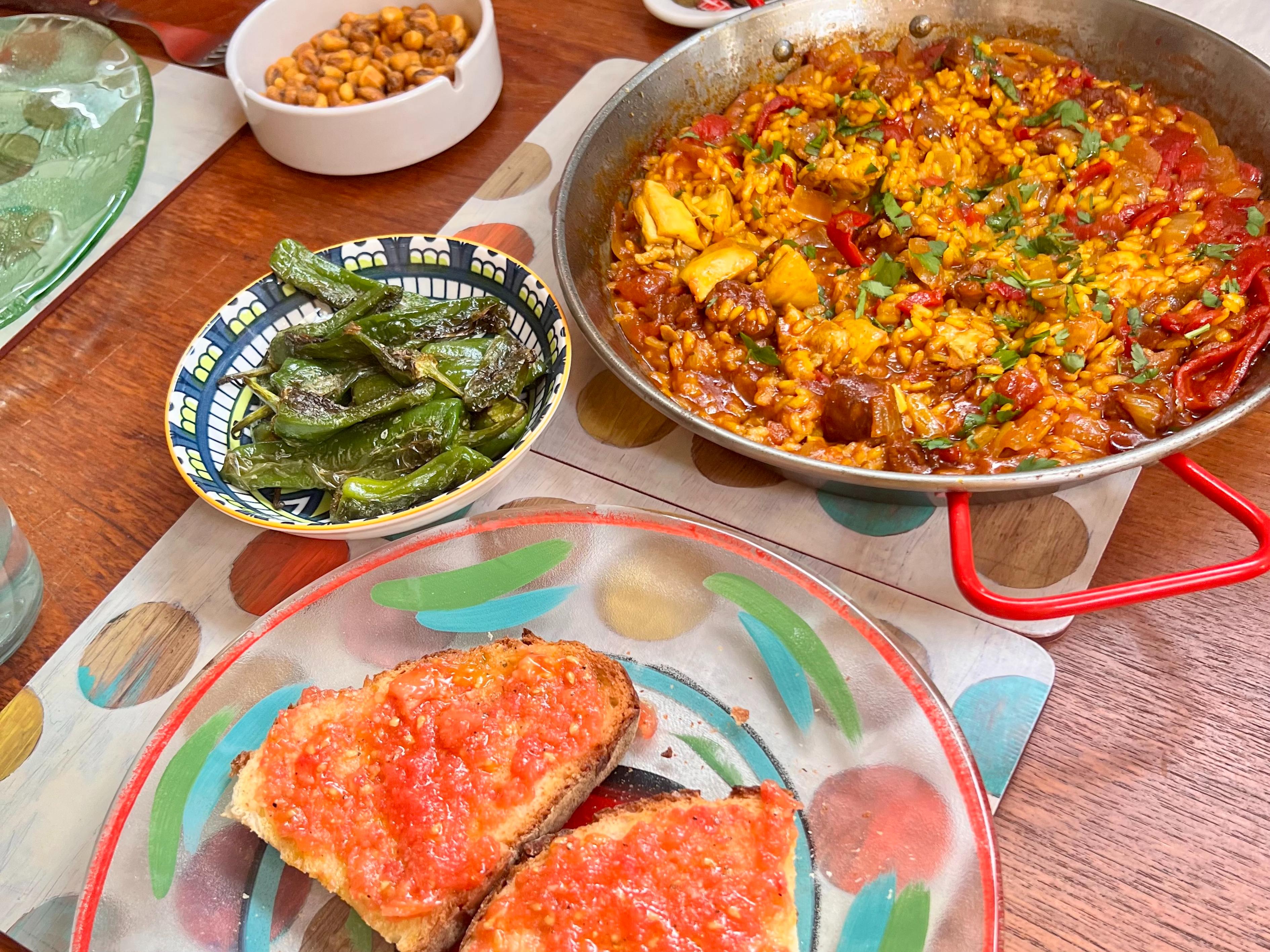 • Pan con tomate (Catalan toast with tomato) with padron peppers (little green peppers from the Basque country pan-fried)