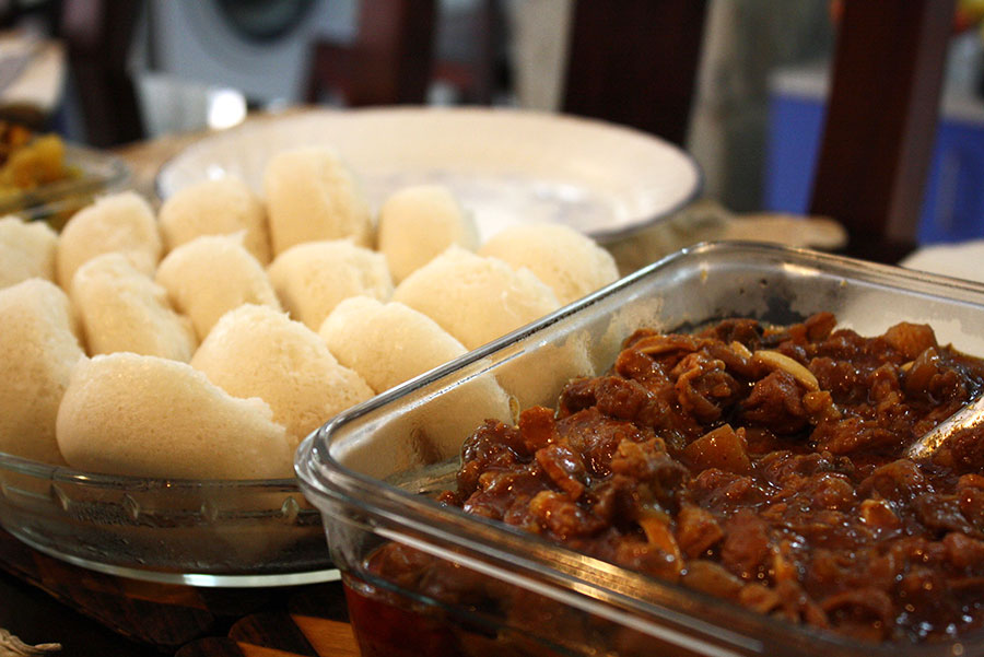 • Appams and chicken stew or Sannas and pork bafat or Chicken ghee roast or Korii rotti