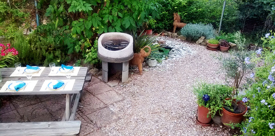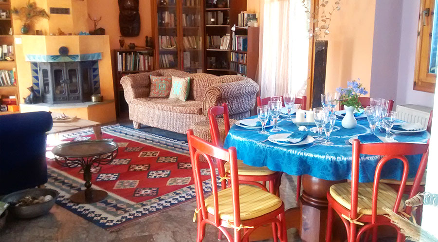 Your meal will be served at the dining table or in the garden area, depending on the weather. You can expect to eat dishes cooked with fresh and seasonal ingredients such as fava beans or olive bread, fish with herbs and pine nuts or or stuffed zucchini flowers with bulgur and baked lamb or traditional pie with wild leafy herbs (such as amaranth, dock weed and dandelion). For dessert you might be treated to pomegranate gelee or a fig strudel in red wine sauce served with Greek yogurt. After your meal you can enjoy some coffee and homemade loukoumi (traditional sweets made from flour and sugar) while sharing travel stories.