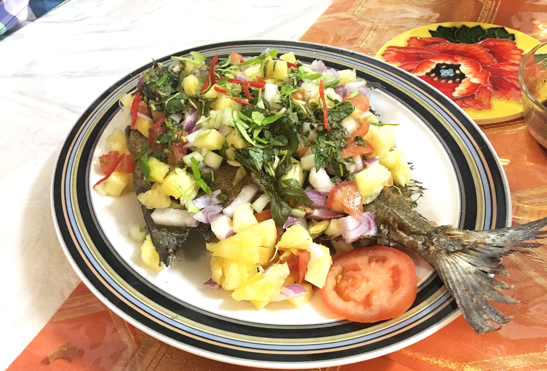 • Fish with pineapple, tomatoes, onions, cilantro, lime and fish sauce