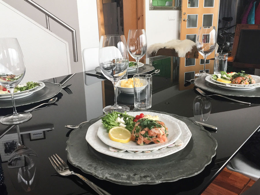 In-home meal: (2-12 guests) A typical meal at Iris and Nonni’s table includes slow-roasted meat, often Icelandic lamb which is organic and exclusively pasture-raised, local fish like Atlantic salmon that is served, raw, smoked or baked, potato dishes, and bright, fresh vegetables. Your Icelandic meal might begin with appetizer like a raw salmon salad and then continue with a hearty main dish such as leg of lamb with roasted potatoes, seasonal vegetables from their greenhouse, and a fresh salad. For dessert Iris offers sweets like berries with traditional Icelandic skyr (a local cultured dairy product like yogurt) or a seasonal fruit tart.