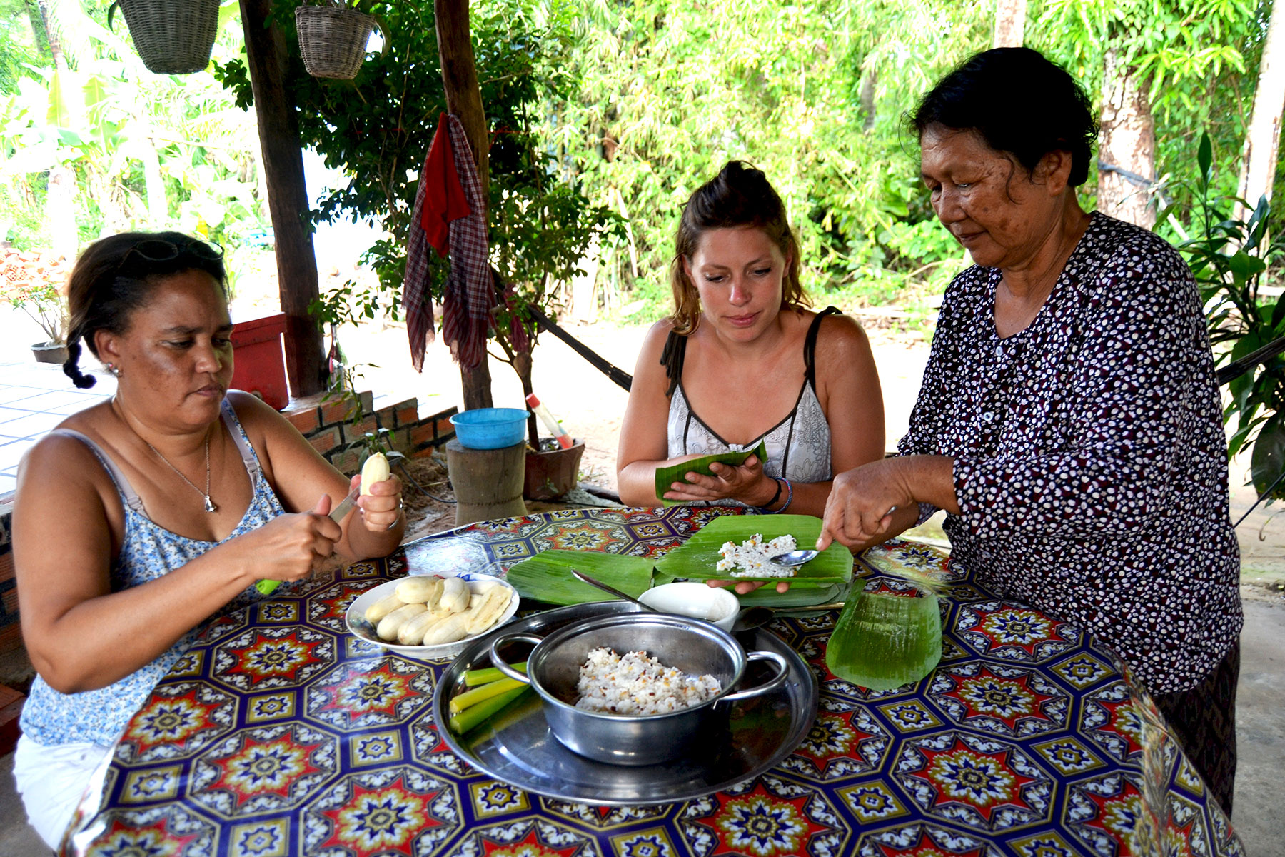 In-home meal: (1-6 guests) Your experience will take place in a traditional kitchen outdoors in the village, surrounded by the rice paddy fields. Ben helps translate as Mrs. Phat La, (the village chief) who will conduct your cooking class does not speak English. Mrs. Phat La learned to cook from her mother and has been cooking for years now. She is renowned for her cooking skills in the village and is often called to prepare traditional wedding feasts. After you learn about local ingredients and traditional cooking techniques, you will sit down to share a meal together that may include dishes such as fresh spring rolls or banana blossom salad, fish/chicken amok (Cambodia’s national dish of a herbed fish mousse) or beef lok lak (beef stir fry) and pumpkin custard or banana rice cake for dessert.