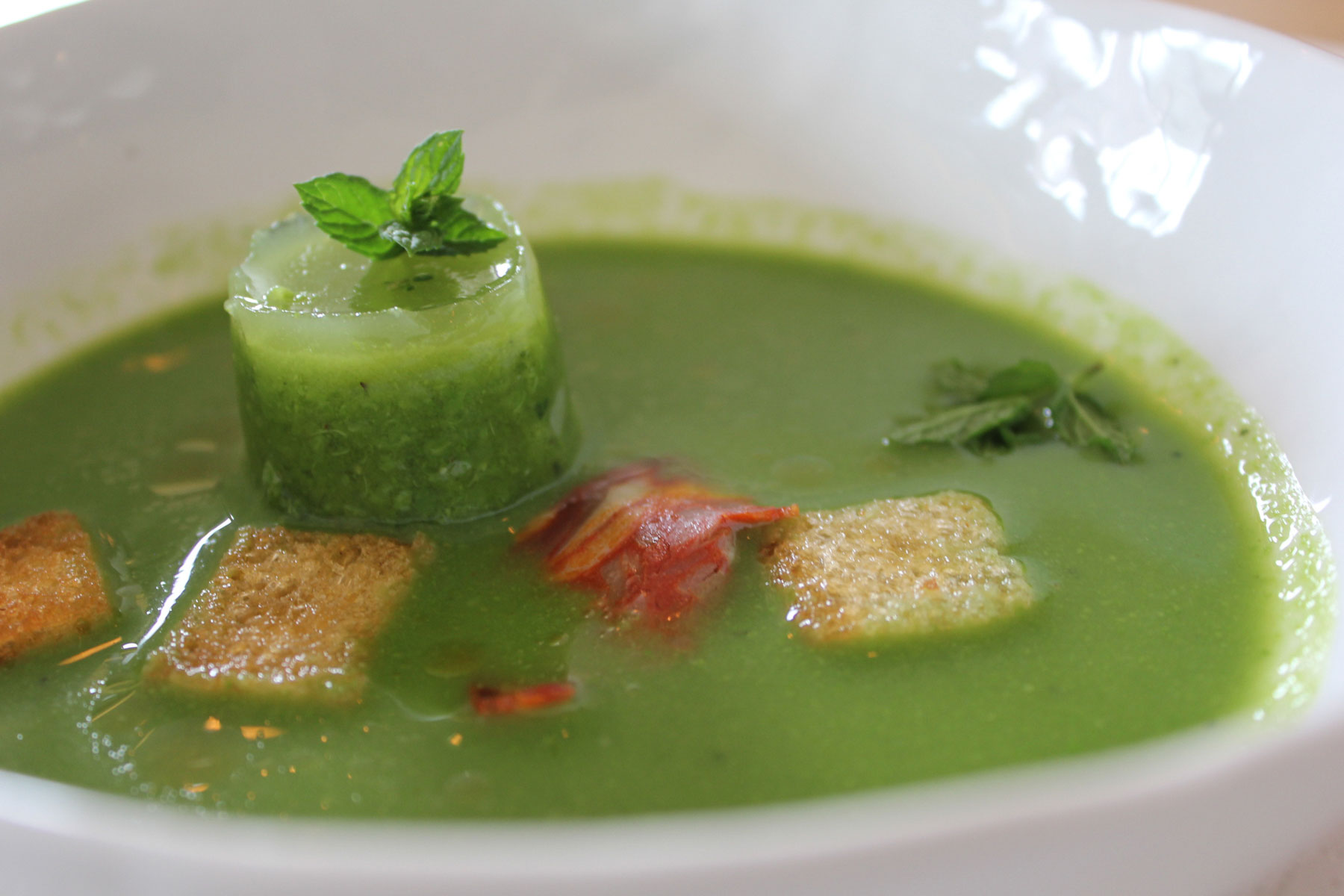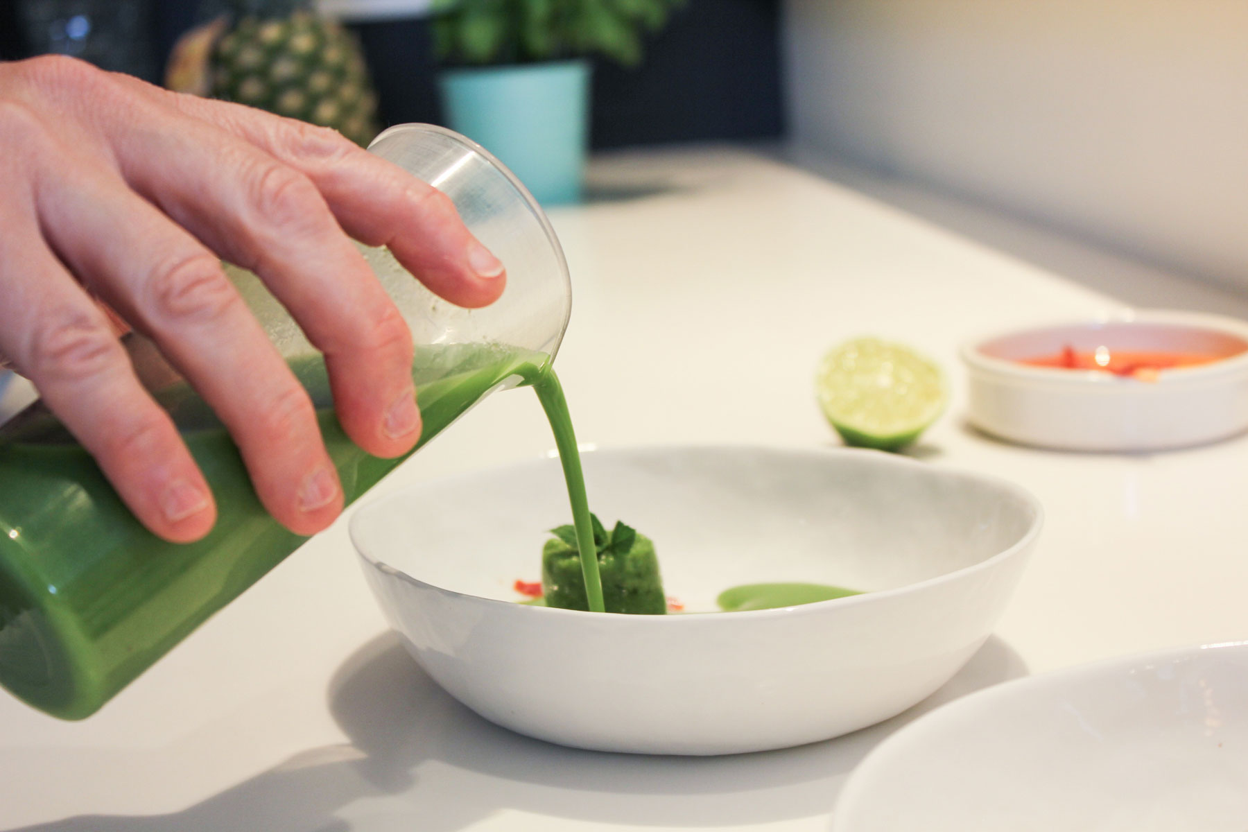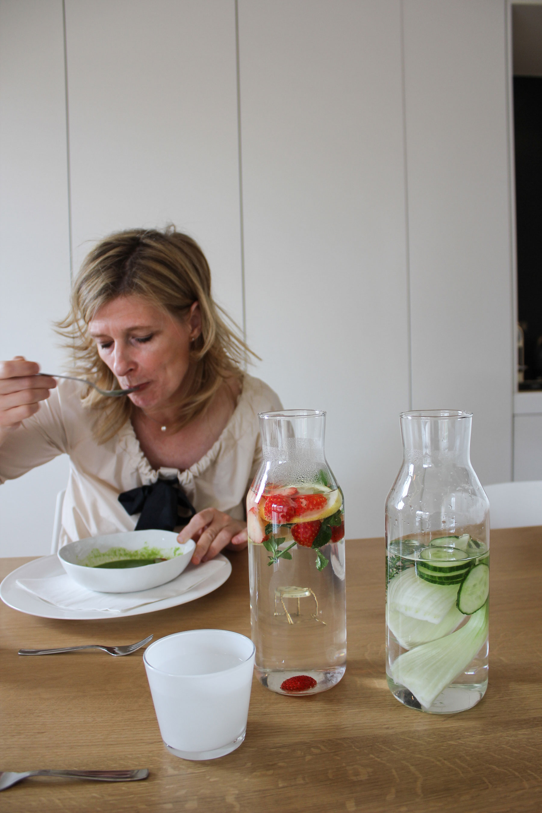 Ine is a true artist with food! After the heavy stews and rich sauces I tasted in Belgium, Ine's fresh, light and colorful dishes were a delightful respite. She is a wealth of knowledge about the city and its restaurants and takes great pride and care in creating and presenting her dishes. I had a truly wonderful meal and delightful afternoon with the lovely Ine. Even the way she presented me with drinking water was fun - in tall bottles filled with fennel, thyme and cucumber in one and strawberries, lemon and mint in the other. It was spa water! She is a wonderful person to chat with about Brussels and her passion for food and presentation really shines through. Her pea gazpacho was a vivid green and the calamari in tomato coulis just melted in my mouth. I had a wonderful food experience with Ine in her minimalist, modern apartment in Brussels.
