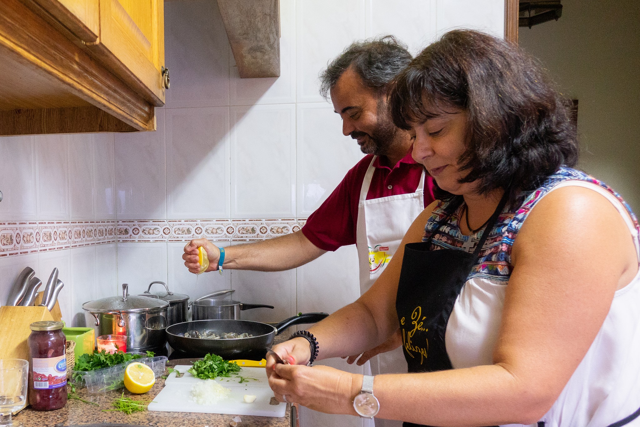 After a welcome appetizer and drink, you will join Paulo and Susan in their home kitchen for your Lisbon cooking class and learn to prepare two traditional Portuguese dishes. Learn the techniques involved in cooking Portuguese cuisine during your cooking class which will last about two hours. Later join your hosts at the dining table to enjoy the meal you helped prepare. Unless you have a particular preference, your hosts will choose to surprise you with their own selection of favorite local dishes - two appetizers and mains. Your meal will conclude with Portuguese dessert.
