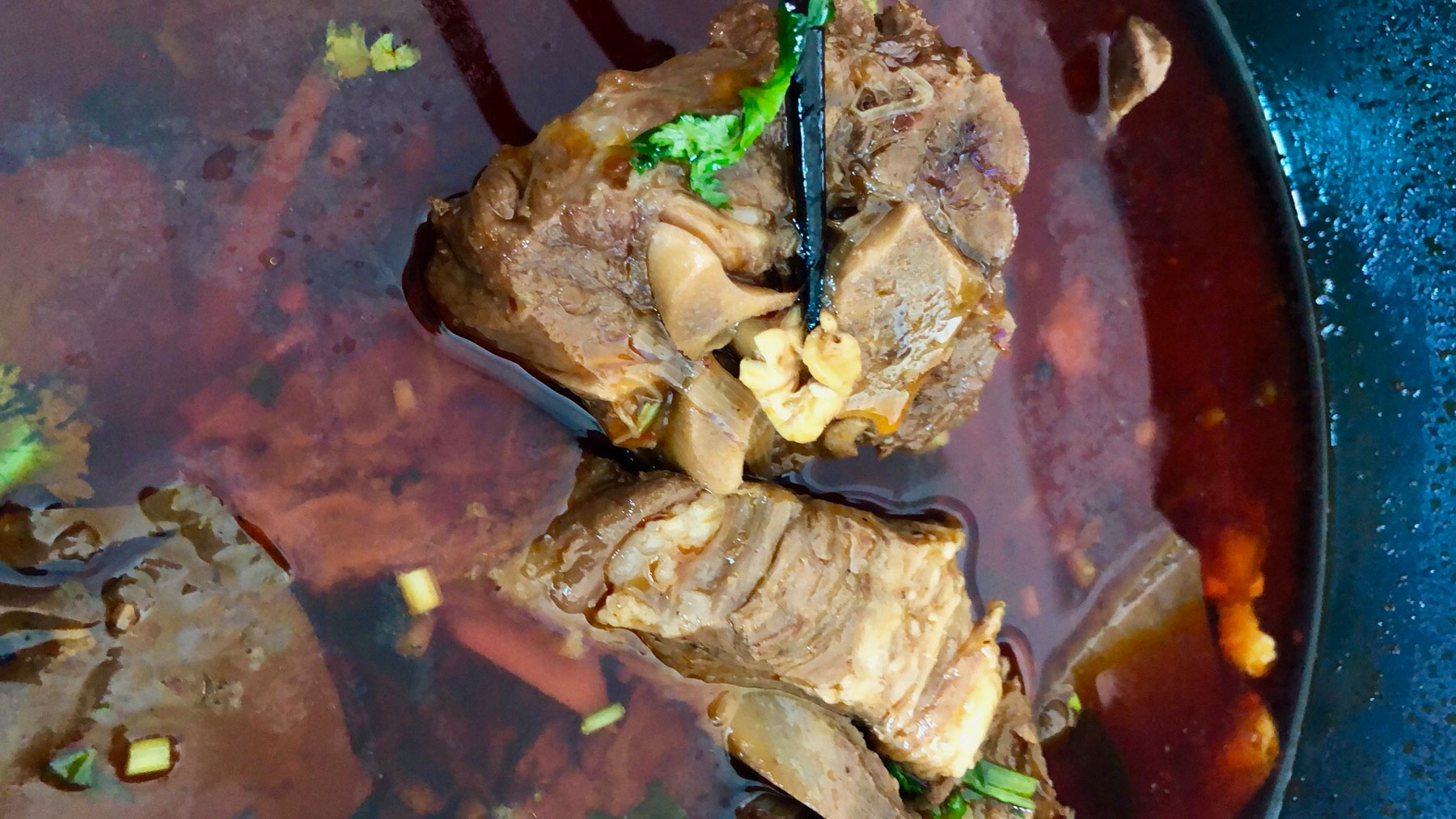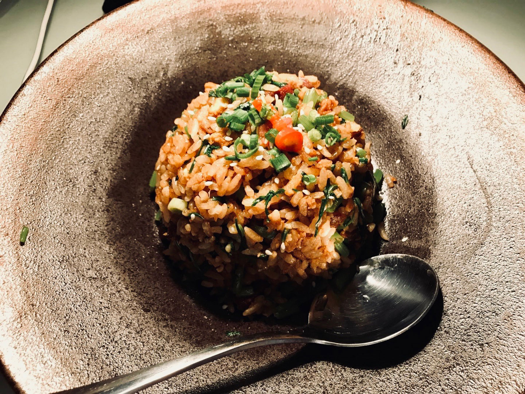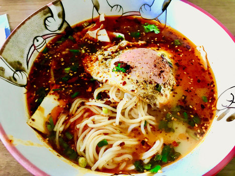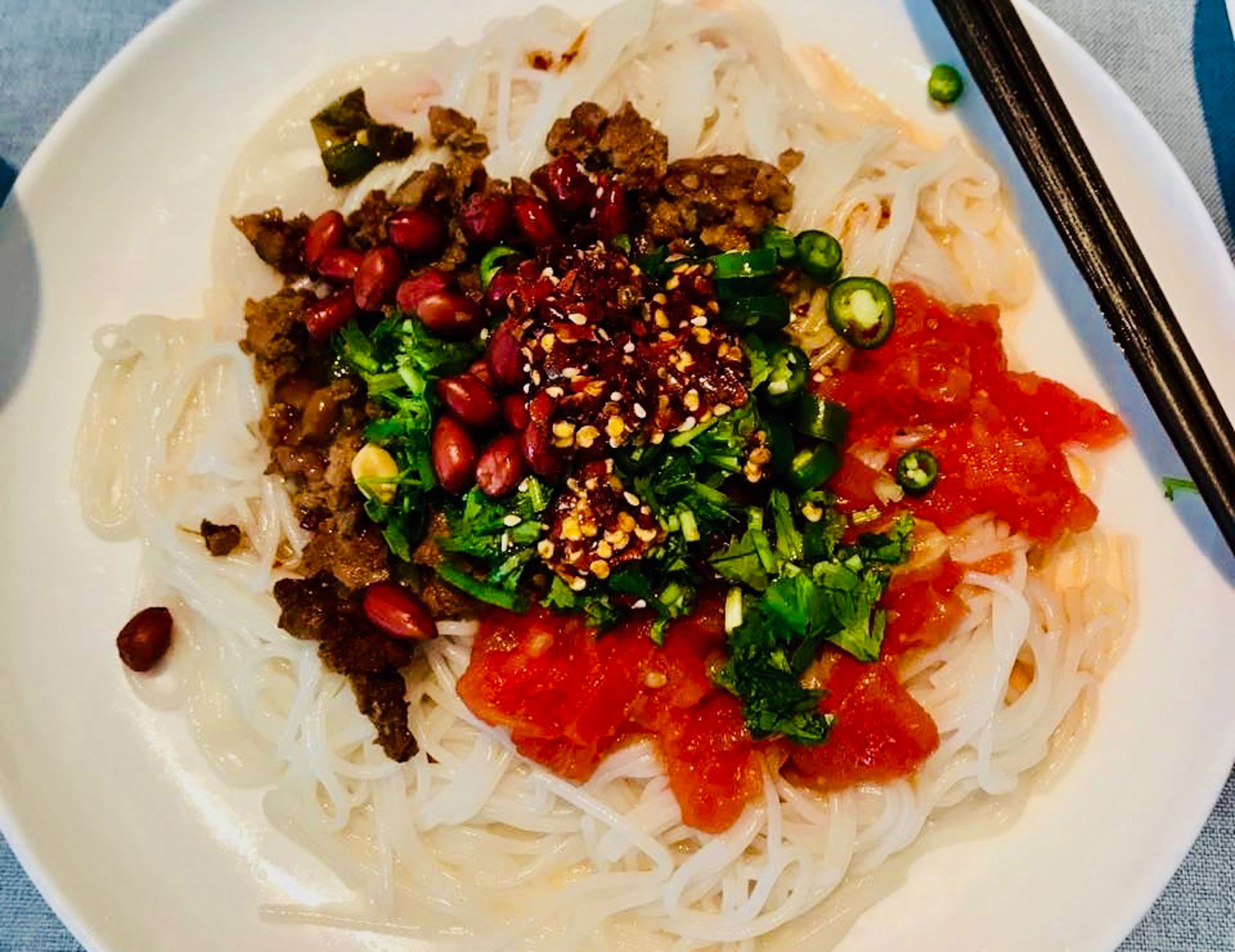 • Home-made rice noodles with minced pork, home-made chili oil, Chinese pickles and tomato sauce