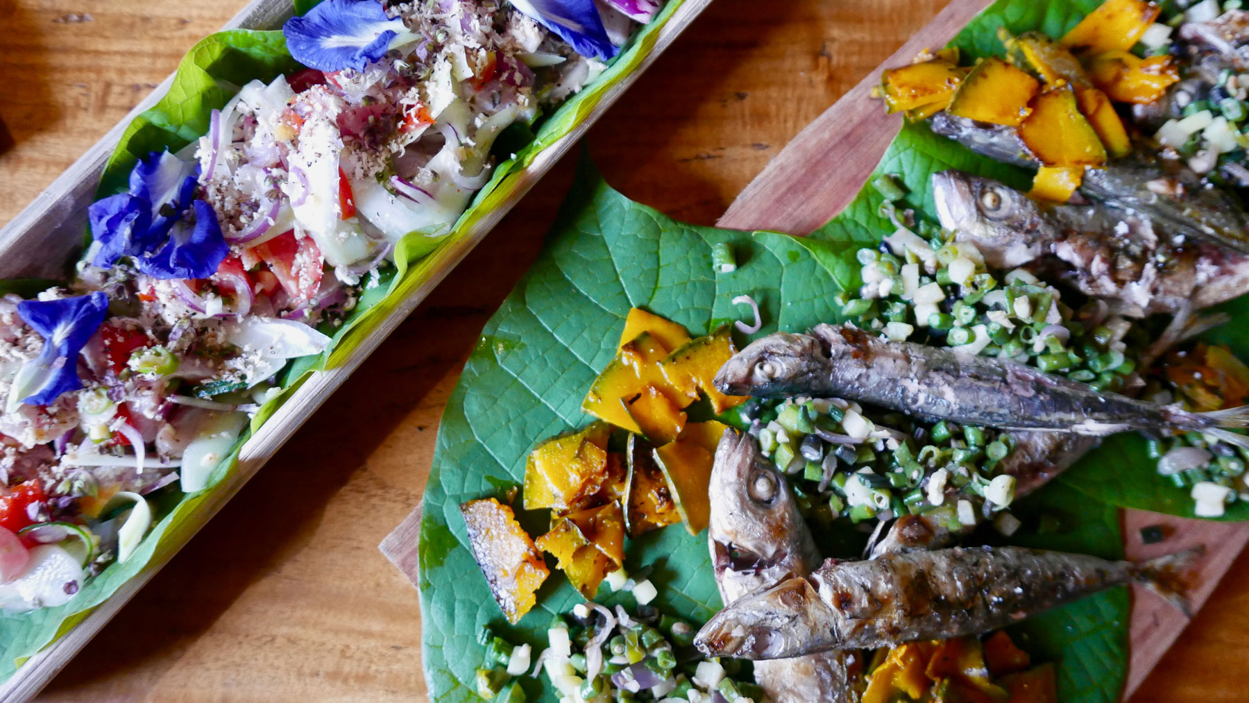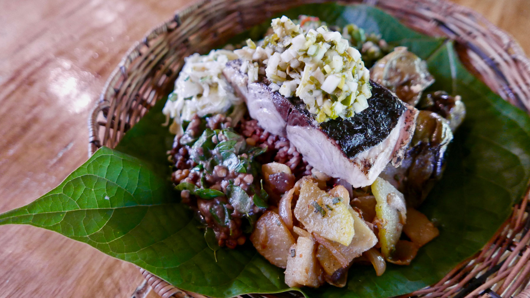 Your menu includes seafood or poultry prepared in three unique and creative ways. For example you might try whole fish in three ways: fish soup with garden vegetables, kinilaw (marinated raw fish in citrus, herbs and spices from their own garden, home made vinegar from fermented langgaw harvested from their their coconut trees), marinated fish fillet grilled over wood fire. Your meal concludes with a dessert such as coconut pudding with fresh fruit, latik and edible flowers. Please note that unlike a typical Traveling Spoon experience that takes place in a home, this experience takes place in your host's resort's restaurant. There will be other guests at the restaurant but they will not join you at your table. Ken and Kim will try to join you at the table during your meal but may not always be able to.