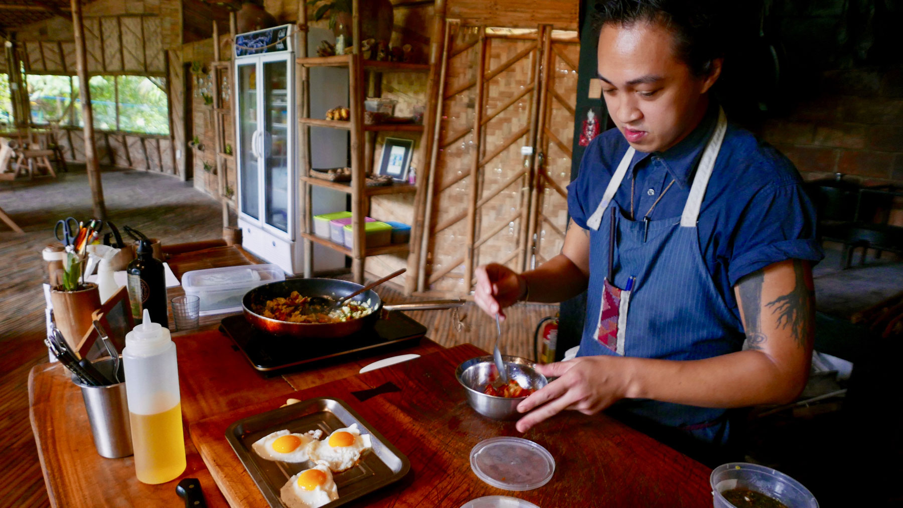 Unlike a typical Traveling Spoon experience that takes place in a home, this unique experience with Kim and Ken takes place at their resort on a beach that houses a bamboo restaurant, organic garden, and guesthouses. Throughout Ken and Kim’s travels in Philippines, they could not find a place that reflected the true Filipino character, offered a unique menu, worked closely with the community, and felt warm and welcoming – so they decided to create their own, as a reflection of their ideal vacation! Everything in the resort is made from bamboo and all-natural materials. They also do not import any ingredients for their restaurant, and use only Filipino products, mostly local from the province to support the local community.
