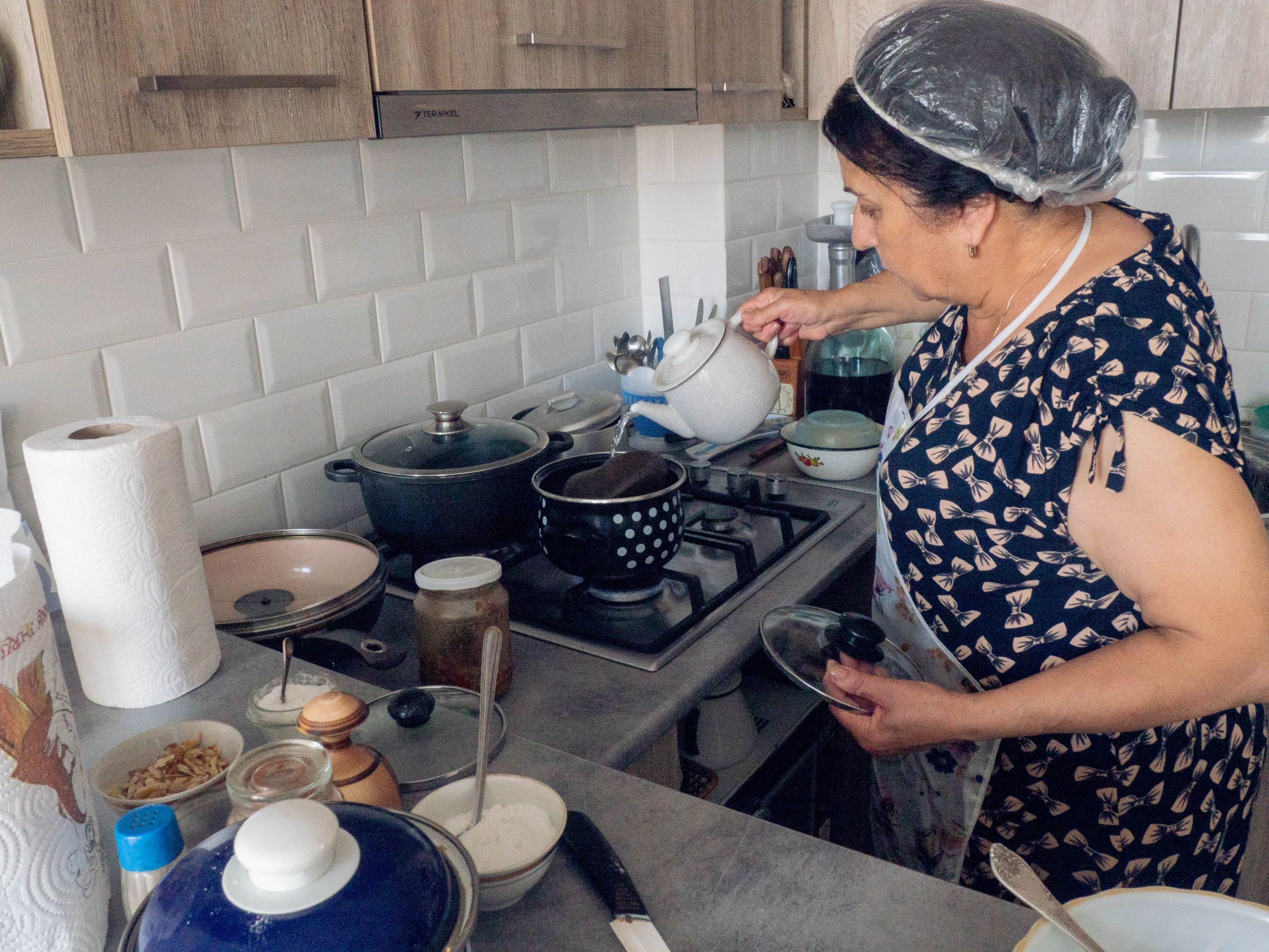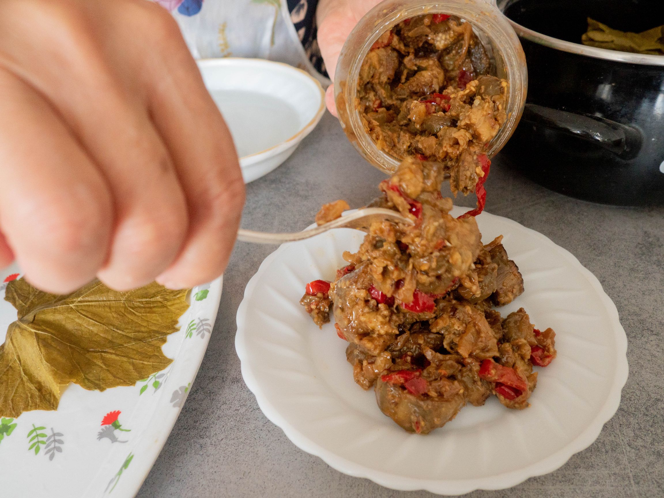 I spent an amazing day with Lasha and his mother Elene in her newly-built apartment building in a suburban, local area. Both are very warm, hospitable people who already have plenty of experience dealing with tourists since they have previously offered these cooking classes to some of Lasha’s AirBnB guests. Both speak great English and were very happy to answer all my questions about the food and cooking, and in addition talking more about Georgian history, tourism and more. My glass was never empty; in a true Georgian fashion, Lasha kept making toasts for everything from future and dreams to parents and Finnish-Georgian friendships (we even toasted for Traveling Spoon at one point!). Both Lasha and Elene made me feel very welcome, and their talkativeness and humour made the time pass very quickly. I thought I’d spent maybe two or three hours with them – turned out to be closer to five hours. At the end of the meal and the actual dessert (pelamushi pudding), they still brought figs and plums to the table - everything was delicious! I greatly enjoyed the experience and the best part was that Lasha and Elene went out of their way to introduce me to some other Georgian foods – even ones that we weren’t cooking. One of my favorite was a delicious tkhemali plum sauce that I got to try.