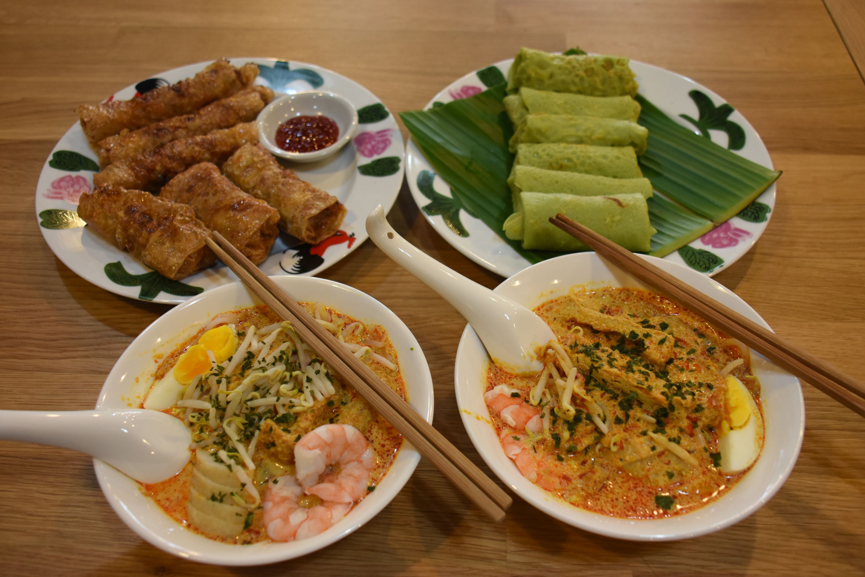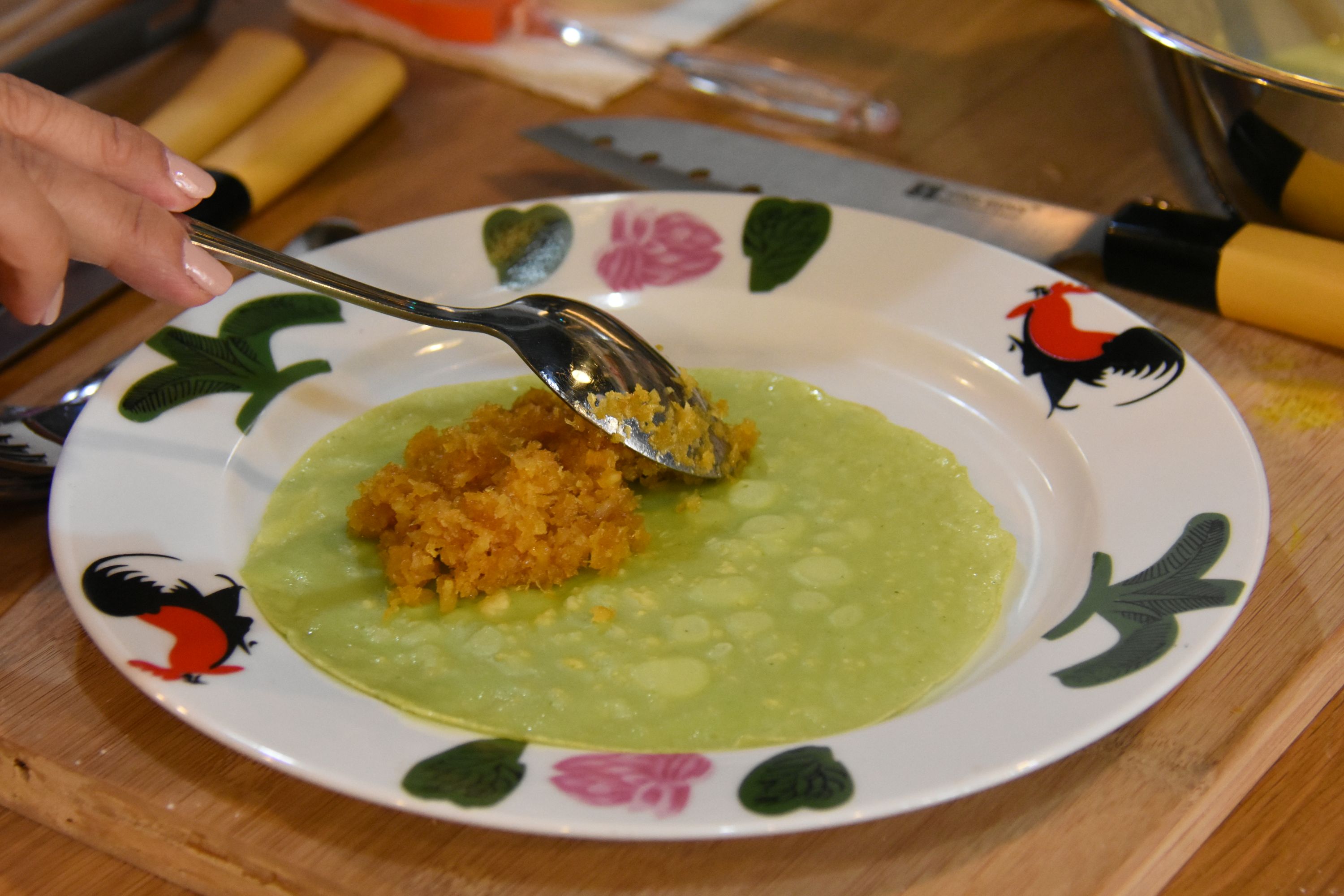 In-home meal: (5-20 guests) Colin (or his colleagues) hosts this experience in a cooking studio, which is located inside a bicycle tour shop. You will pass through bicycles before entering a well-lit, colorfully decorated studio with pastel pots and a mural. Your menu might include dishes such as hainanese chicken rice, ngo hiang (five-spiced meat mixed with water chestnuts, carrots, garlic, shallots and spring onions and wrapped in bean curd skin), and kueh dadar (a fragrant pandan and coconut flavored dessert crepe). The menu is subjected to change, depending on what fresh ingredients are available!